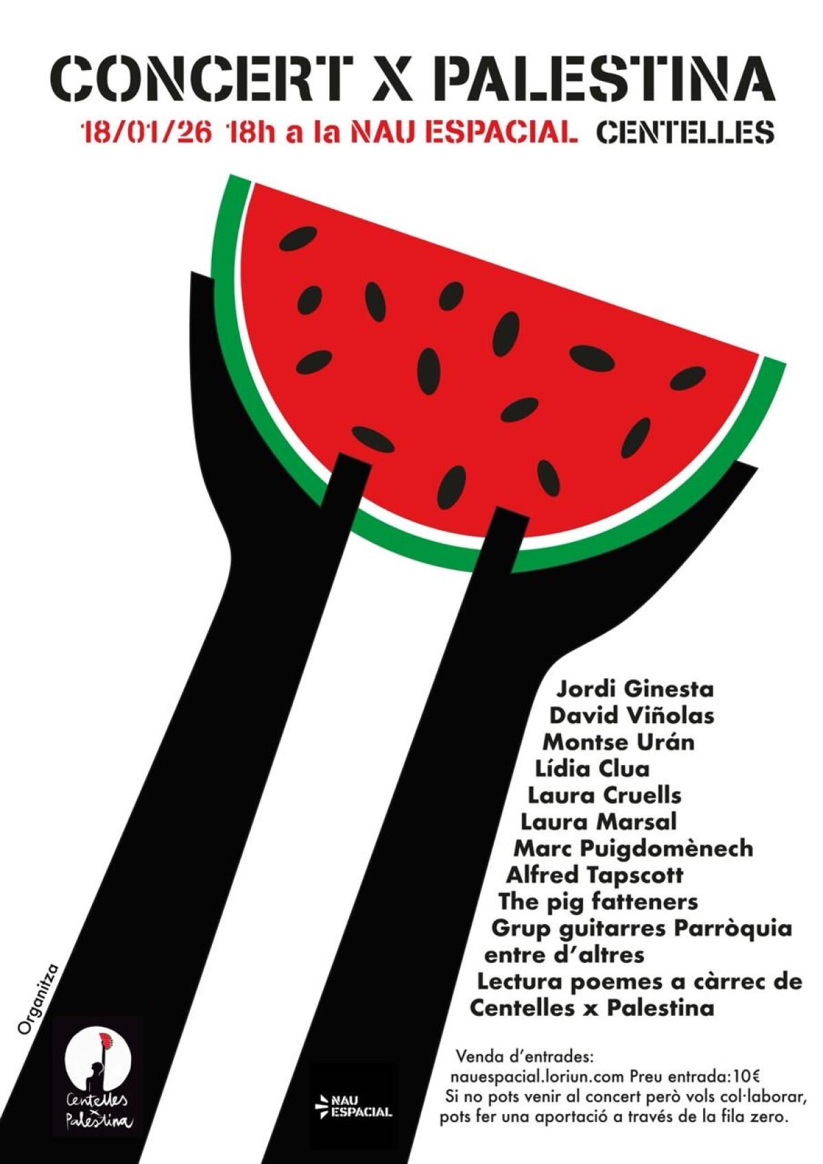 Concert organitzat per “Centelles per Palestina” amb voluntat de recaptar fons per les víctimes del genocidi palestí. Actuacions d’artistes locals.